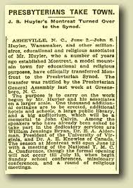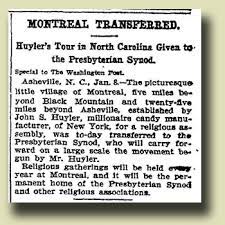 In 1905, Huyler responded to a proposal by the Rev. J. R. Howerton, First Presbyterian Church, Charlotte, North Carolina, to have the Synod of North Carolina take over the ownership and operation of Montreat. The agreement was fully implemented in 1907.